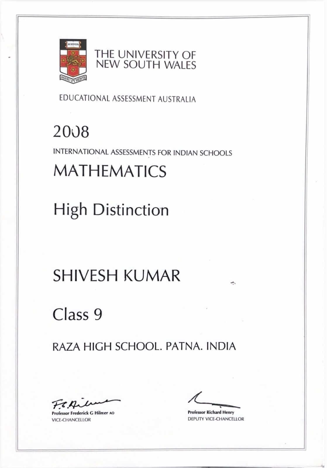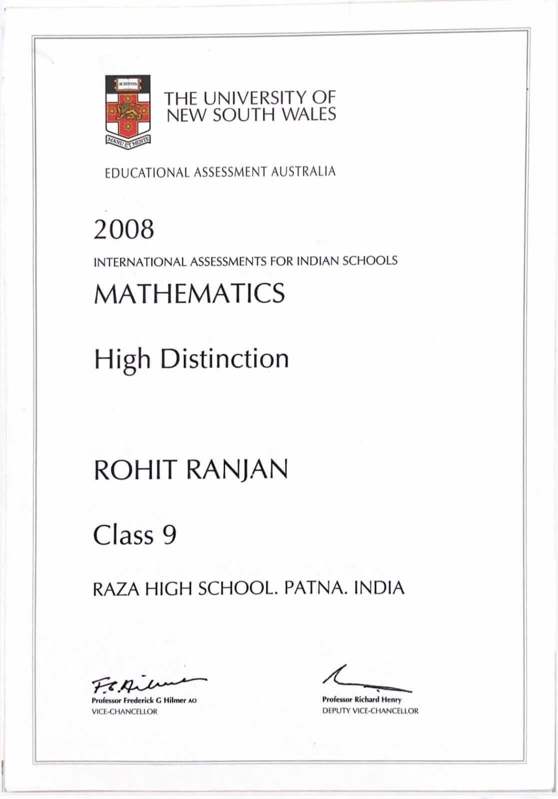 • High Distinction in Mathematics and Science