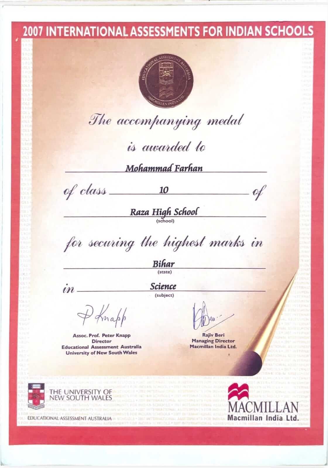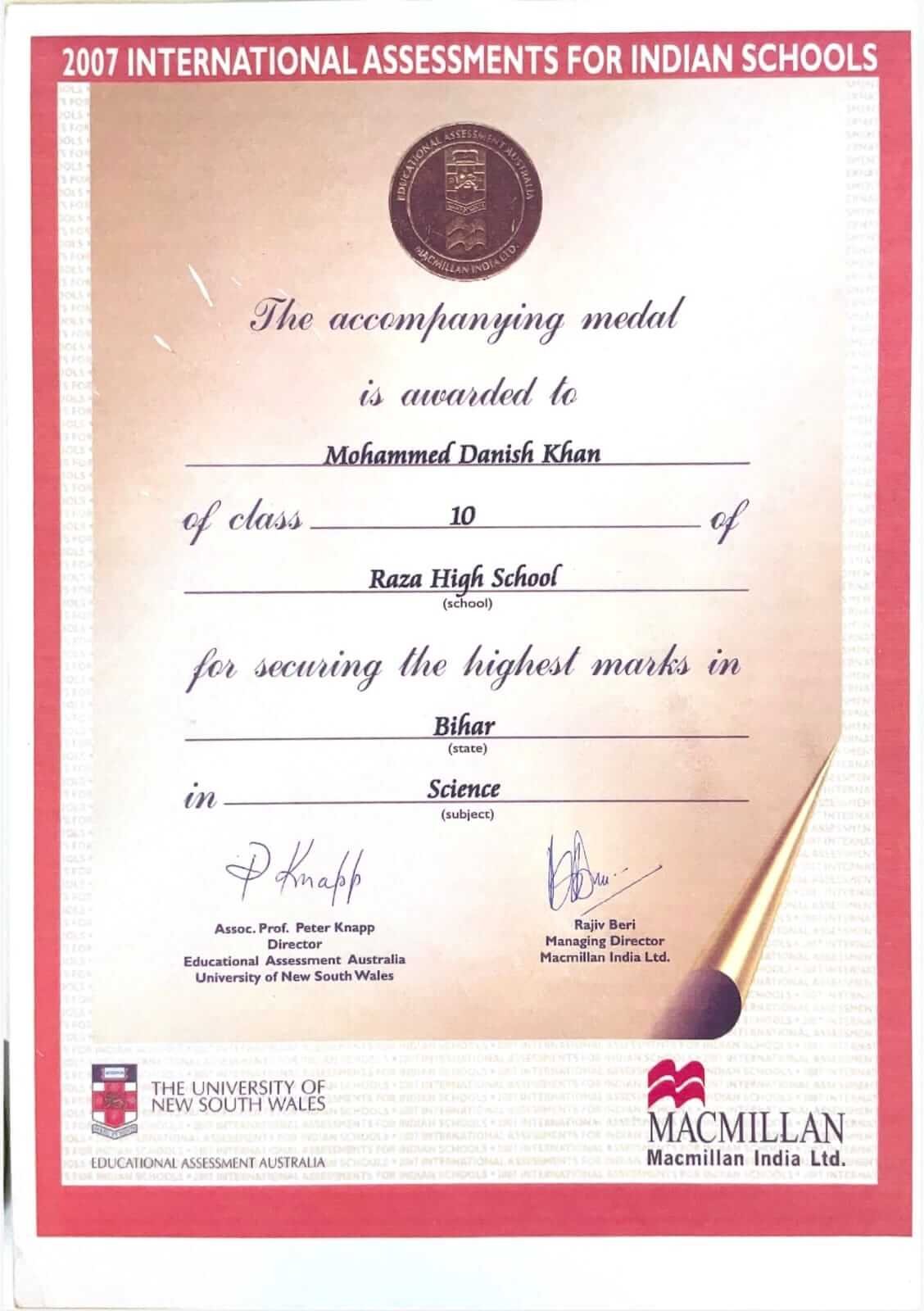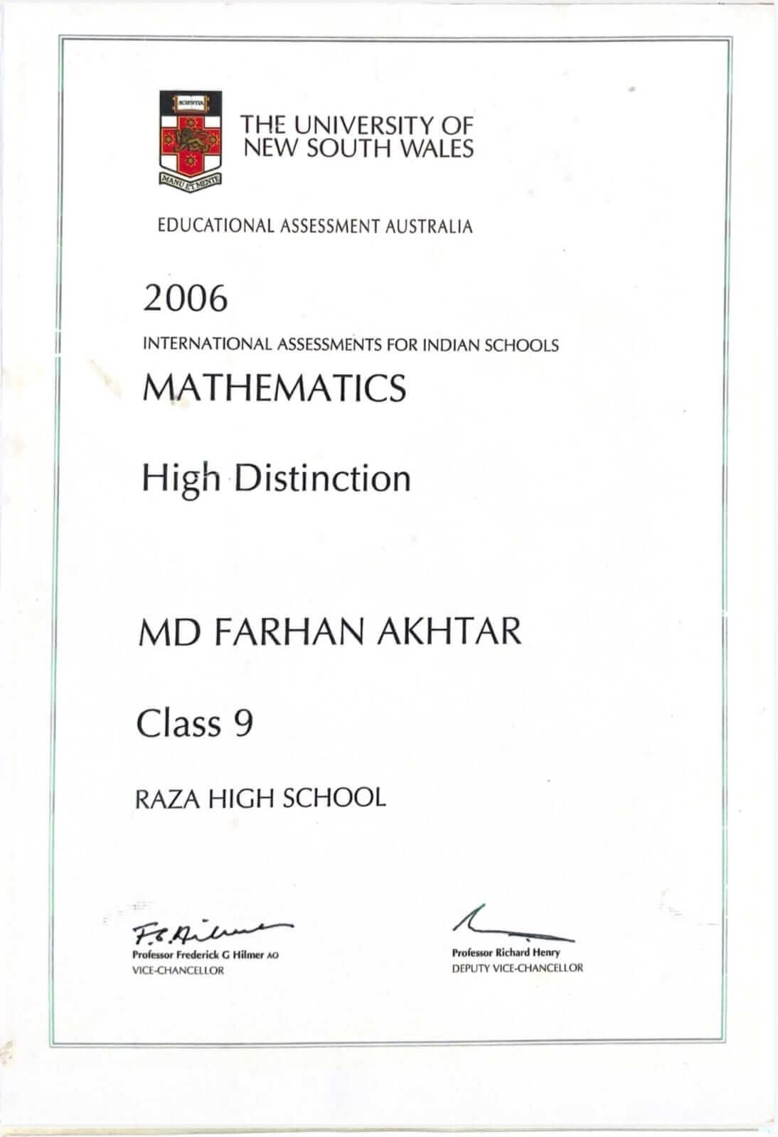 Raza High School has earned recognition from an internationally reputed academic institution, the University of New South Wales, Australia, for maintaining high standards in education.