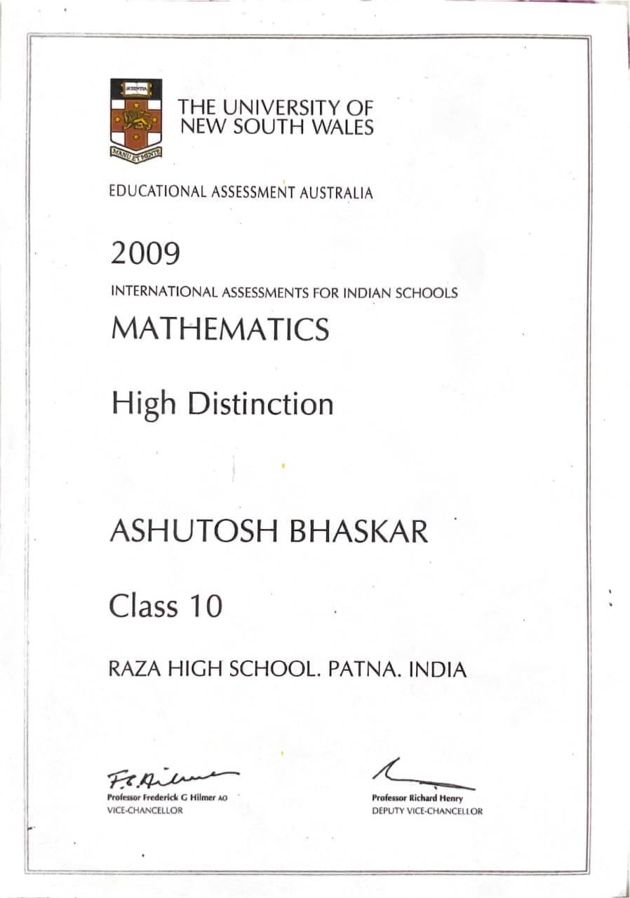 Ashutosh Bhaskar — Secured 1st position in the State in Mathematics, in a combined examination conducted by a reputed Australian university (2010).